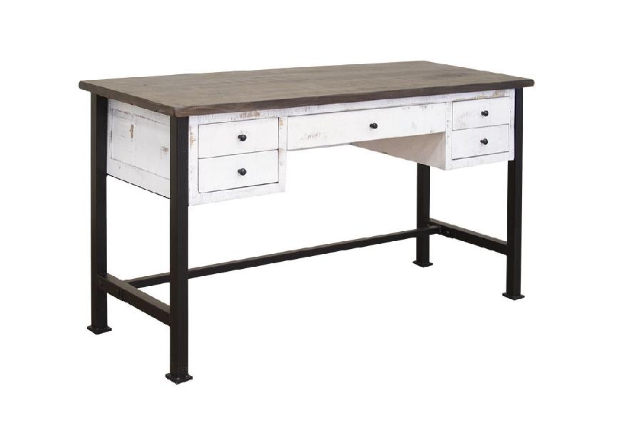 5 Drawer Desk. Introducing our Pueblo White collection, crafted from solid pine wood. This rustic collection is the perfect addition to bring your dream space to life. It features a hand-distressed finish in white and brown on the tops.