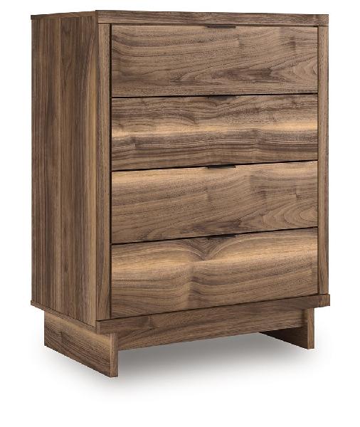 Nostalgic style, retooled for today’s trends. This chest of drawers puts an elevated twist on mod aesthetics. Its warm brown tones reflect the mid-century vibes you love, while the angular base incorporates contemporary motifs. Integrated drawer handles round out the look in sleek style. With this chest, you can build your bedroom into a modern haven with a touch of retro-cool flair.