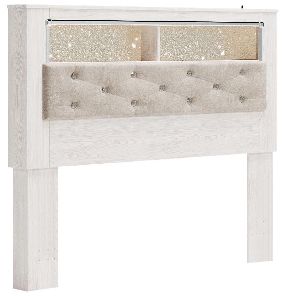 The epitome of fashion-forward design, this queen upholstered bookcase headboard is a beautiful blend of comfort and luxury. Shiny chrome-tone accents, a pearlized finish and button-tufted upholstery bring a glam touch to the richly rustic appearance. Remote-controlled LED lighting adds style and modern convenience to your restful retreat.