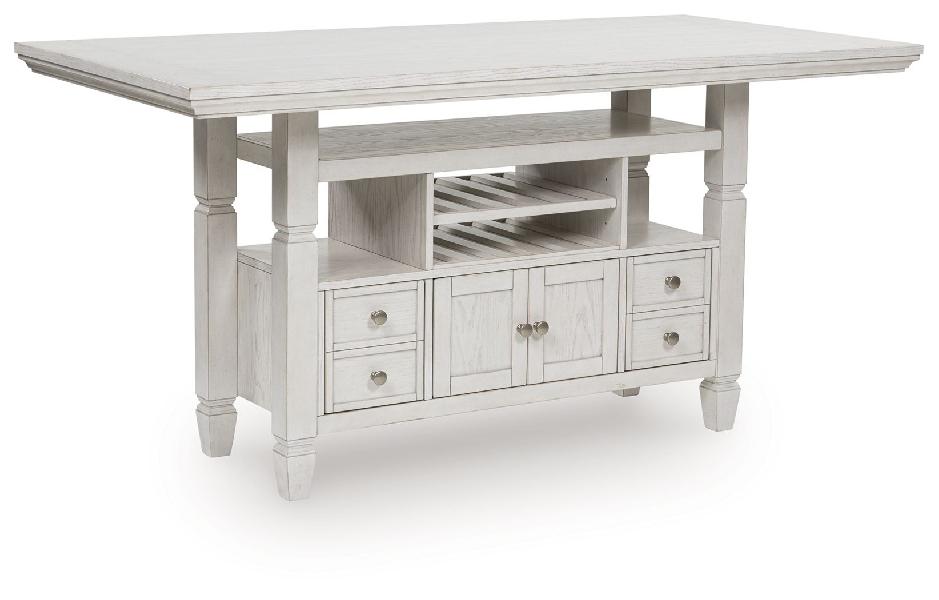 This counter height dining table brings an air of casual charm to mealtime. With its antiqued white finish, farmhouse-style dining has never been so fashionable. And this curated approach to everyday function is loaded with storage options, from cabinets to drawers to wine shelves. All that’s missing is you and your family.