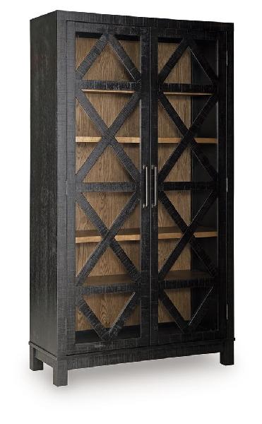 Put your distinctive style on display with this beautifully crafted accent cabinet. Distressed diamond-patterned doors with glass inserts create a chic frame for your favorite decor, while the contrasting black and natural brown finishes add a touch of drama. The magnificent 5-shelf cabinet offers a stunning solution to conquer clutter and showcase your best pieces.